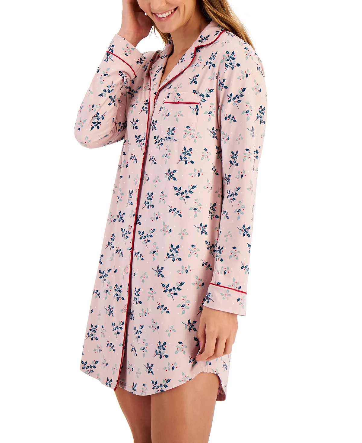 A longer length turns the classic pajama top into one-piece sleep shirt with a fun print in this cozy style from Charter Club.
