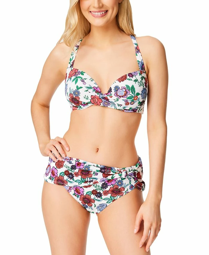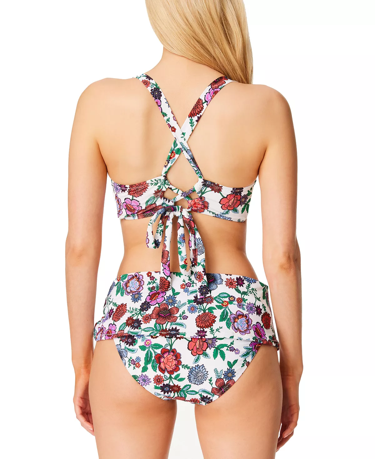 Jessica Simpson blends feminine flair and supportive wear with the built in cups on this floral bikini top and the shirred waistband of these hipster swim bottoms, ensuring you can splash around in comfort.