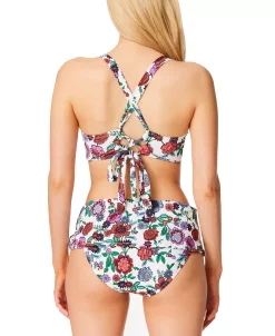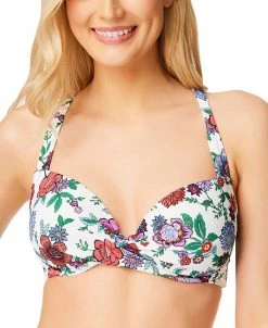 Floral print and twisted fabric brings eye-catching design to your waterside wardrobe while the built in cups and adjustable tie straps keep you supported as you splash then relax in this Jessica Simpson bikini top.