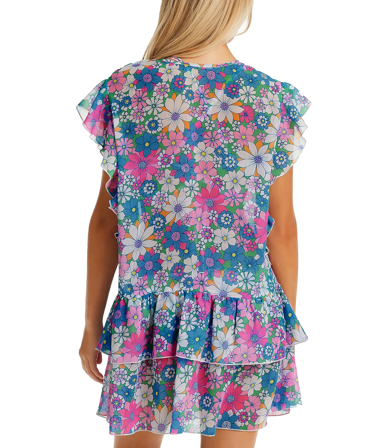 Jessica Simpson knows how to keep you covered in cuteness with this tie-neck printed cover-up featuring a tiered hem and flutter sleeves for added style.