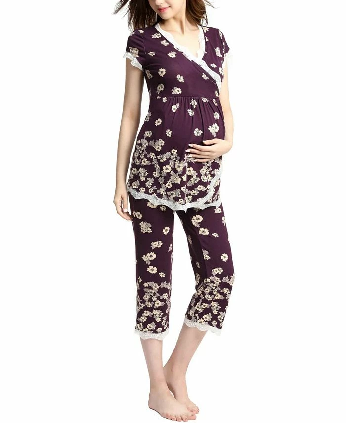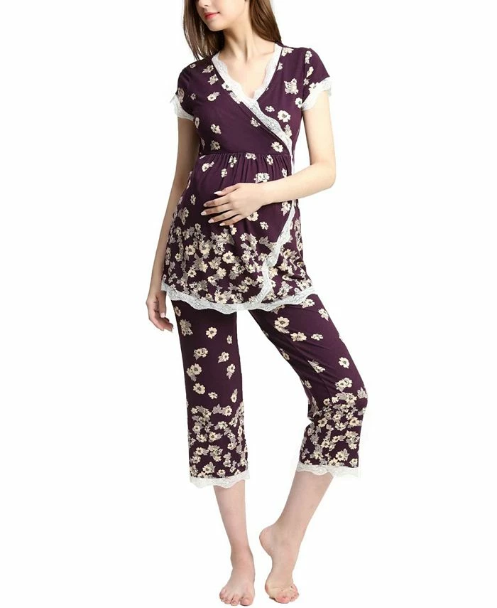 A maternity and nursing 2-piece pajama set by Kimi & Kai. A ultra soft pajama top is designed to adapt to your changing body from pregnancy to motherhood. Comfy capri length over belly pant is designed especially for C-section recovery.