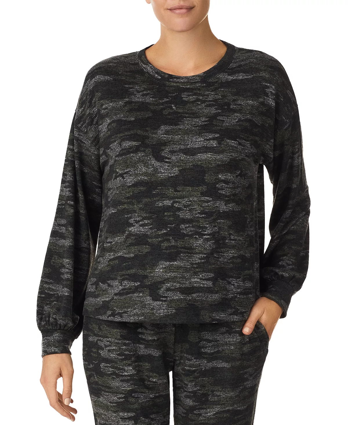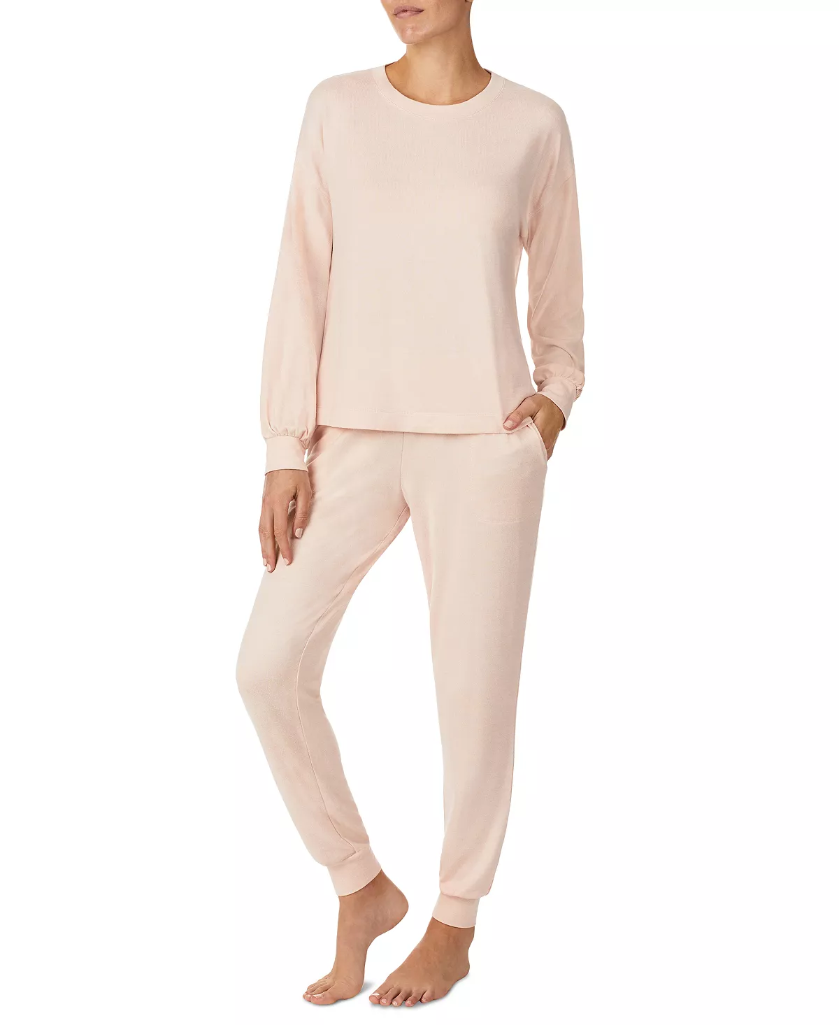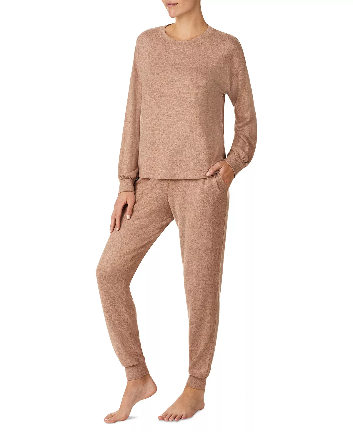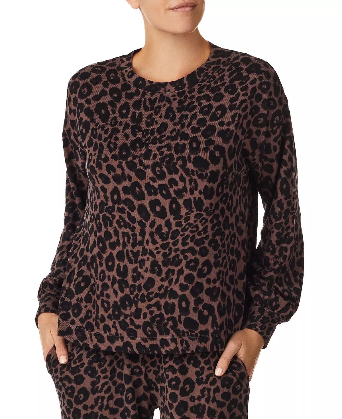 - Top: Round neckline; long sleeves; pullover styling; brushed jersey fabric
